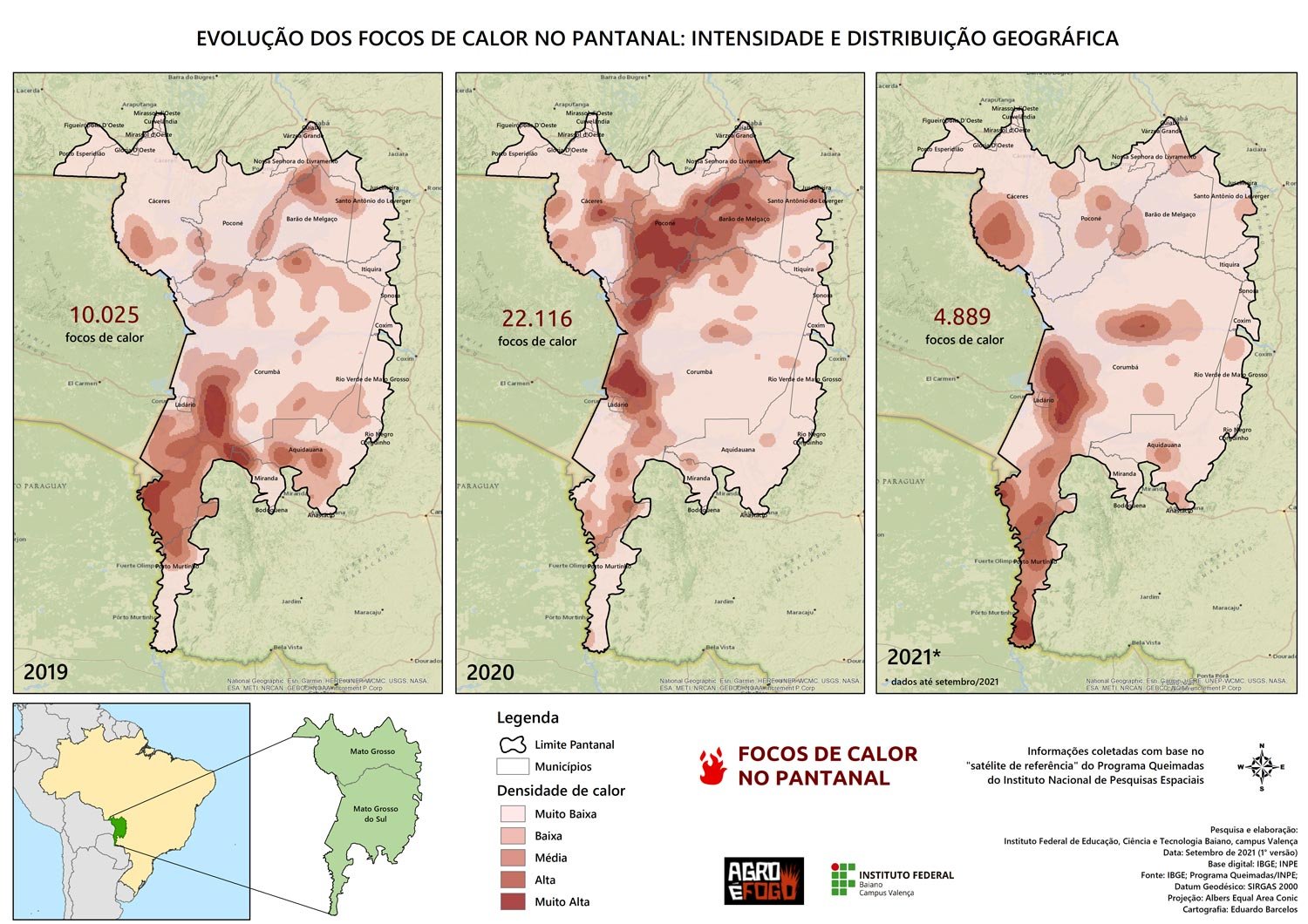 Este ciclo es una de las explicaciones de la catástrofe enfrentada ese año, cuyas repercusiones continúan en la actualidad, con la amenaza de continuidad de incendios de la misma proporción. Según los datos del Inpe[4], de enero a septiembre de 2021 se produjeron más de 5.000 focos de incendio en el Pantanal. En el año 2020, hubo 22.116 focos. El agronegocio fue el gran detonante que hizo que los incendios se extendieran a gran escala.
